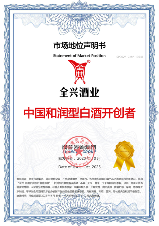 全兴酒业曾三次荣获中国名酒及国度质量金质章,2025年10月,