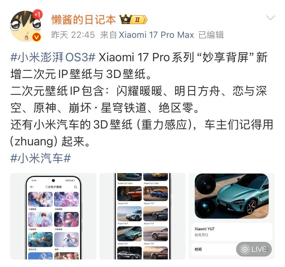 不竭强化其产物的差同化体验。对于小米17 Pro用户而言,此次更新最惹人瞩目的是引入了多款抢手二次元IP合做的专属静态取动态壁纸。据收集爆料,配相信息或存正在迭代或误差可能,